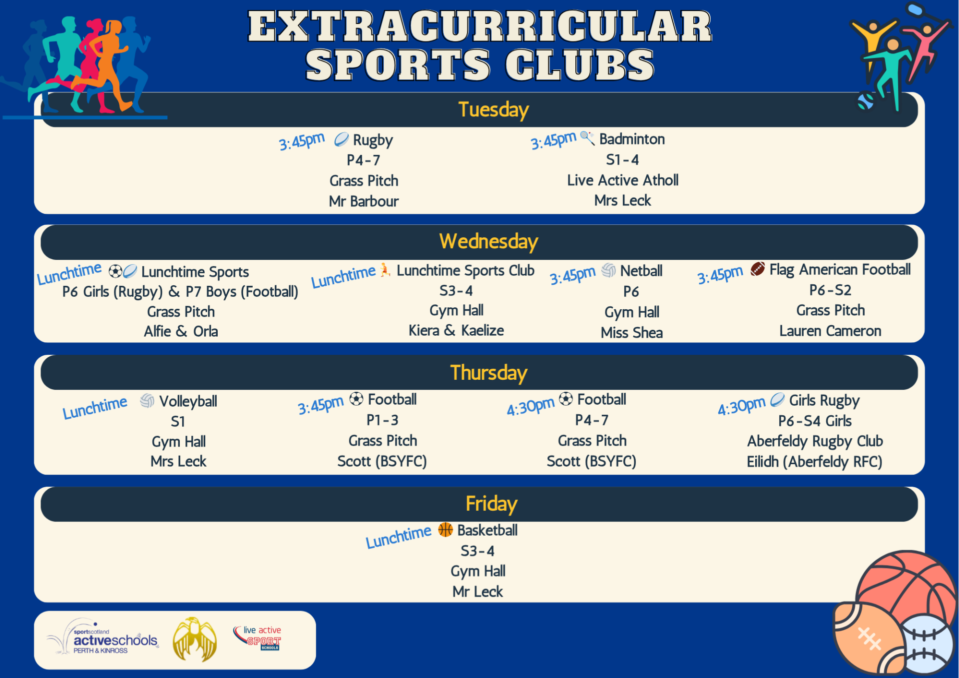 Gregor Ross, the Active Schools Coordinator for Highland Perthshire, works closely with the HWB Faculty, school staff, senior pupils and local sports clubs to bring as many fun and inclusive extracurricular sporting opportunities as possible to our pupils. This work depends on the incredible efforts of volunteers – and we’d love to welcome more! If you’re passionate about helping young people stay active, volunteering just 30–60 minutes a week for 4–6 weeks can make a big difference.